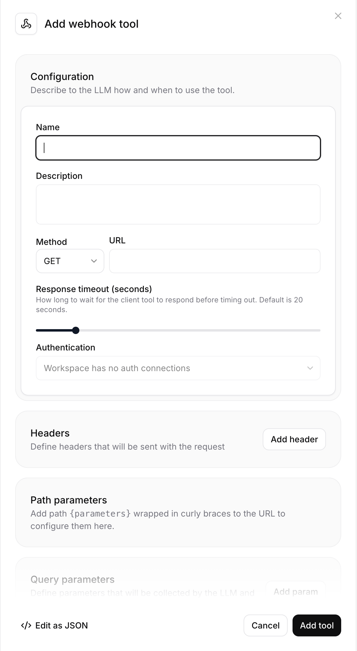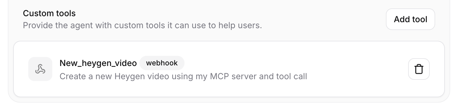 The foundation remains the properly configured ElevenLabs conversational agent with custom tools for Heygen integration. Under tools, you'll find the Add webhook tool.